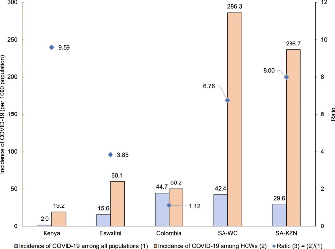 Taking into consideration study feasibility and the importance of demonstrating the economic cost of HCW infection in a variety of settings, we included five study sites: Kenya, Eswatini, Colombia, and Western Cape and KwaZulu-Natal provinces of South Africa. The five sites were selected primarily based on data availability. In South Africa, we selected KwaZulu-Natal and Western Cape provinces because national aggregates were not available for South Africa, and these two provinces accounted for 40% of the national COVID-19 burden by February 2021. The study sites had diverse profiles with respect to their overall demographics, HCW density, SARS-CoV-2 infection rates, and COVID-19 mortality rates in both HCWs and the general population (Supplementary Table 3).