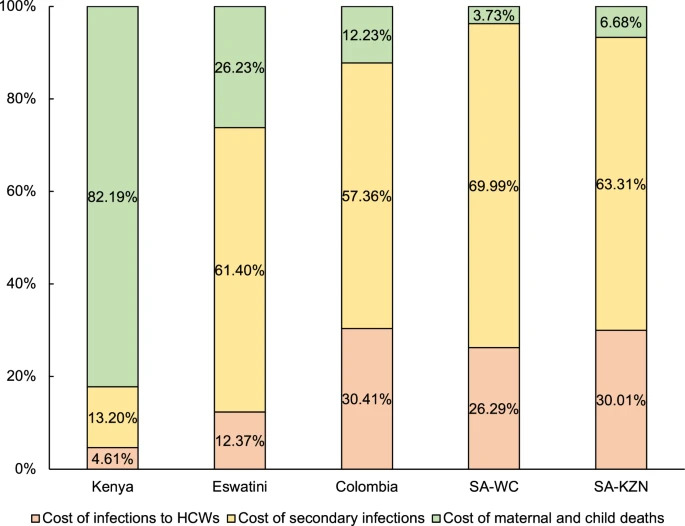 The costs presented in this paper are likely to be conservative estimates of the cost to society of SARS-CoV-2 infections in HCWs for several reasons. First, it is likely that SARS-CoV-2 infections, related illnesses, and deaths were underreported. Under-reporting is common for infectious diseases generally, but challenges in accurately reporting SARS-CoV-2 infections and deaths are well recognized, including poor access to diagnostic tests in the first year of the pandemic, limited testing capacity, and inability to determine causality in the event of death31. Second, SARS-CoV-2 infections and related illnesses and deaths among HCWs are likely to have longer-term impacts on the health workforce pipeline that we did not attempt to capture. Third, we did not include SARS-CoV-2 infections in community health workers (CHWs) in this analysis because the five study sites lacked adequate data on both SARS-CoV-2 infection rates and the size of the CHW workforce. Economic losses would have been higher if CHWs were included in the analysis, especially in countries such as Kenya, Eswatini, and South Africa, where CHWs play an important role in health care delivery. Finally, we focused on three pathways through which HCW infections incur economic costs. While these pathways likely comprise the most important sources of economic losses, we were not able to quantify (1) the costs associated with worse health outcomes beyond excess maternal and child mortality, especially with respect to non-communicable diseases, which are prevalent; (2) nor does this analysis include the cost of training HCWs to replace those who are no longer working or alive as a result of SARS-CoV-2 infection; and (3) this study does not account for the costs associated with the mental health impacts of COVID-19 on HCWs or other long-term sequelae of infection such as long COVID32.