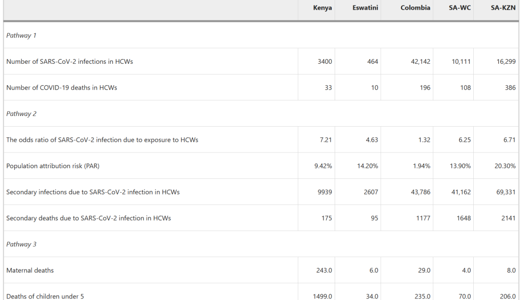 Table 1 shows the absolute number of SARS-CoV-2 infections and associated deaths accounted for in each pathway. Compared with the number of SARS-CoV-2 infections in HCWs, there were at least three times as many secondary infections in people who were in close contact with HCWs in all study sites except Colombia. Deaths due to secondary infections were greater than HCW deaths due to primary infection in every study site. There were more than 15 times as many deaths due to secondary infection as deaths from COVID-19 in HCWs in Western Cape province, South Africa. With respect to excess maternal and child mortality in the setting of health care workforce disruptions, there were an estimated 243 excess maternal deaths and 1499 excess deaths in children under five in Kenya, the highest toll across all study sites. Colombia had the second-highest number of excess maternal and child deaths, while maternal death rates in Eswatini and both provinces of South Africa were least affected by COVID-19-related disturbances to the health care workforce.