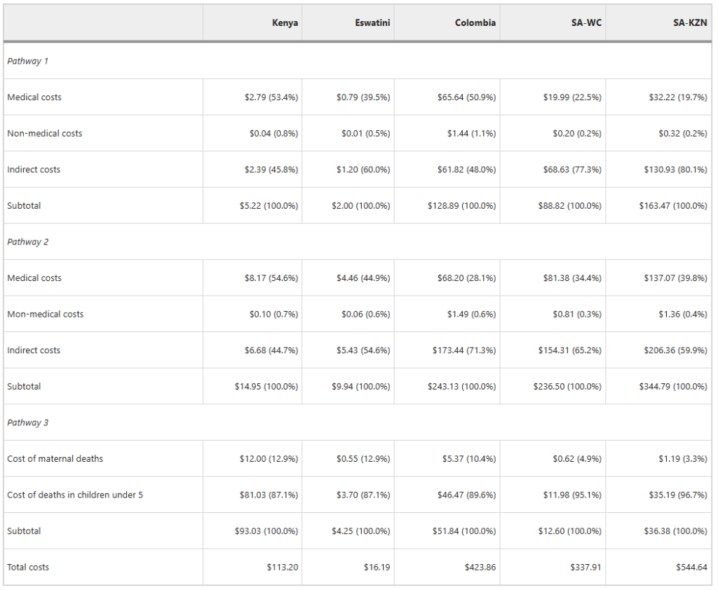 Table 2 presents the economic costs associated with each pathway. Costs accrued along Pathway 1 ranged from US$2.00 million in Eswatini to US$163.47 million in KwaZulu-Natal province, South Africa, alone, with a combined cost of US$252.29 million across both provinces in South Africa. Indirect costs comprised the largest share of costs associated with HCW infections and deaths in Eswatini as well as KwaZulu-Natal and Western Cape provinces in South Africa.
