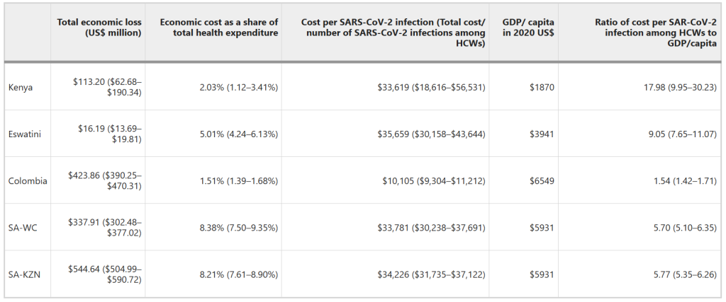 Health care workers (HCWs) experienced greater risk of SARS-CoV-2 infection during the COVID-19 pandemic. This study applies a cost-of-illness (COI) approach to model the economic burden associated with SARS-CoV-2 infections among HCWs in five low- and middle-income sites (Kenya, Eswatini, Colombia, KwaZulu-Natal province, and Western Cape province of South Africa) during the first year of the pandemic. We find that not only did HCWs have a higher incidence of COVID-19 than the general population, but in all sites except Colombia, viral transmission from infected HCWs to close contacts resulted in substantial secondary SARS-CoV-2 infection and death. Disruption in health services as a result of HCW illness affected maternal and child deaths dramatically. Total economic losses attributable to SARS-CoV-2 infection among HCWs as a share of total health expenditure ranged from 1.51% in Colombia to 8.38% in Western Cape province, South Africa. This economic burden to society highlights the importance of adequate infection prevention and control measures to minimize the risk of SARS-CoV-2 infection in HCWs. Though it is well-known and widely understood that COVID-19 is both a health crisis and economic crisis, the extent to which health care worker (HCW) SARS-CoV-2 infections pose a society-wide economic burden is less well understood. The burden of illness among HCWs includes costs of medical care, diminished personal earnings, and lost economic productivity over time1. When HCWs become infected in a pandemic, these costs are amplified by greater infectious spread, including in health care settings, within households of HCWs, and to the wider community2. In addition, however, high rates of SARS-CoV-2 infection among HCWs have the potential to generate a substantial, longer-term economic toll by disrupting the delivery of health services, such as care for cancer patients and dialysis services, as well as maternal and child health services3,4. Consequences of the pandemic for maternal and child health care include but are not limited to fewer immunizations being given, fewer women receiving the full scope of antenatal care, and fewer babies being delivered in health care facilities5,6. Besides the service disruption due to SARS-CoV-2 infections among HCWs, the influx of COVID-19 patients and stringent control measures affect the delivery of essential services3. Economic costs associated with disruptions in health service delivery are borne by entire societies, especially in low- and middle-income countries (LMICs), where human resources for health are already in chronically short supply. Decades-long efforts to build human resources for health are a testament that the health care workforce cannot be easily or rapidly generated.