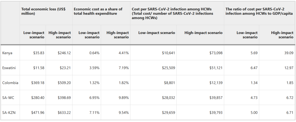 Table 4 presents the total economic burden of SARS-CoV-2 infection among HCWs and the economic burden per HCW infection for both low- and high-impact scenarios. In the low-impact scenario, the total economic losses ranged from US$11.58 million in Eswatini to US$471.96 million in KwaZulu-Natal province, South Africa, while these costs were US$23.21 million and US$633.22 million, respectively, in the high-impact scenario. As a share of total health expenditure, the economic losses ranged from 0.64% in Kenya to 7.11% in KwaZulu-Natal province, South Africa, in the low-impact scenario. In the high-impact scenario, economic losses as a share of total health expenditure were 1.82% in Colombia and up to 9.89% in Western Cape province, South Africa.