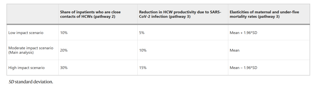 Pathway 3: To estimate the additional child deaths resulting from health workforce disruptions as a result of SARS-CoV-2 infections and deaths in HCWs and productivity reduction among HCWs who remained on duty, we first converted the duration of HCW absence from work and the associated reduction in productivity into a decrease in HCW density. For HCWs who were not infected with SARS-CoV-2, we assumed a 10% reduction in their working productivity absent essential team members in the main analysis, using the same assumption as Roberton in the main analysis19. We estimated the resulting change in the U5MR based on its elasticity relative to HCW density36 and, from this, calculated additional deaths in children under five years old. We applied the same method to estimate excess maternal deaths, using the MMR and its elasticity relative to HCW density.